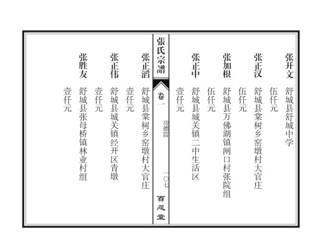 张氏宗谱 张胜友 张正伟 张正滔 张正中 张加根 张正汉 张开文 伍仟元 舒城县棠树乡窑墩村大官庄 舒城县棠树乡窑墩村大官庄 壹仟元 舒城县城关镇二中生活区 舒城县万佛湖镇闸口村张院组 伍仟元 壹仟元 舒城县张母桥镇林业村组 壹仟元 舒城县舒城中学 伍仟元 壹仟元 舒城县城关镇经开区青墩 卷一 功德篇 一〇七 百忍堂