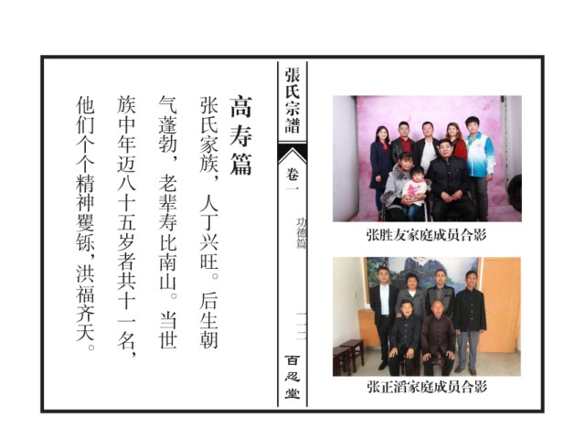 张氏宗谱 他们个个精神矍铄,洪福齐天。 族中年迈八十五岁者共十一名, 气蓬勃,老辈寿比南山。当世 张氏家族,人丁兴旺。后生朝 高 寿 篇 卷一 功德篇 张胜友家庭成员合影 一一二 百忍堂 张正滔家庭成员合影