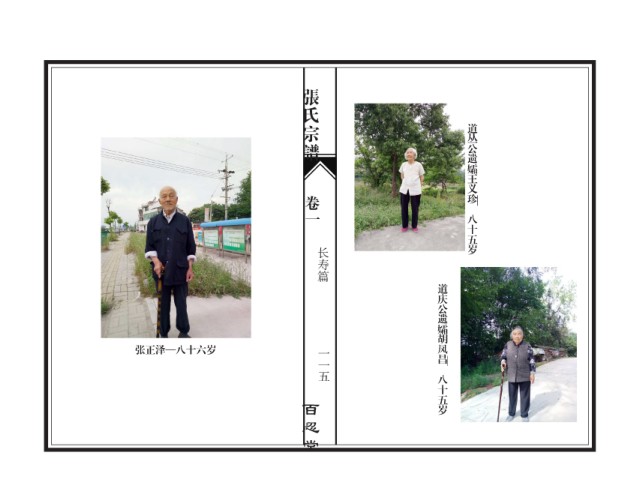 张氏宗谱 道丛公遗孀王义珍 卷一 — 八十五岁 长寿篇 道庆公遗孀胡凤昌 一一五 张正泽—八十六岁 — 八十五岁 百忍堂
