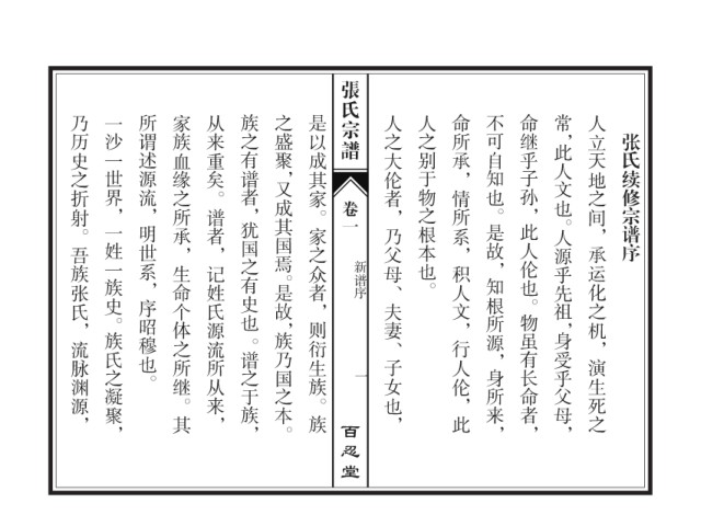 乃历史之折射。吾族张氏,流脉渊源, 一沙一世界,一姓一族史。族氏之凝聚, 所谓述源流,明世系,序昭穆也。 家族血缘之所承,生命个体之所继。其 从来重矣。谱者,记姓氏源流所从来, 族之有谱者,犹国之有史也 之盛聚,又成其国焉。是故,族乃国之本。 是以成其家。家之众者,则衍生族。族 人之大伦者,乃父母、夫妻、子女也, 人之别于物之根本也。 命所承,情所系,积人文,行人伦,此 不可自知也。是故,知根所源,身所来, 命继乎子孙,此人伦也。物虽有长命者, 常,此人文也。人源乎先祖,身受乎父母, 人立天地之间,承运化之机,演生死之