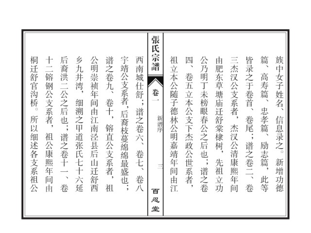 桐迁舒官沟桥。所以细述各支系祖公 十二镕钢公支系者,祖公康熙年间由 后裔洪二公之后也;谱之卷十一、卷 乡九井湾,细溯之甲道张氏七十六延 公明崇祯年间由江南泾县后山迁舒西 谱之卷九、卷十,镕直公支系者,祖 宇靖公支系者,后裔枝蔓绵绵最盛也; 西南城仕舒;谱之卷六、卷七、卷八 祖立本公随子德林公明嘉靖年间由江 四、卷五立本公支下杰政公世系者, 公乃明丁未榜眼春公之后也;谱之卷 由肥东草塘庙迁舒棠棣树,先祖立功 三杰汉公支系者,杰汉公清康熙年间 皆录之于卷首、卷尾;谱之卷二、卷 篇、高寿篇、忠孝篇、励志篇,此等 族中女子姓名、信息录之。新增功德