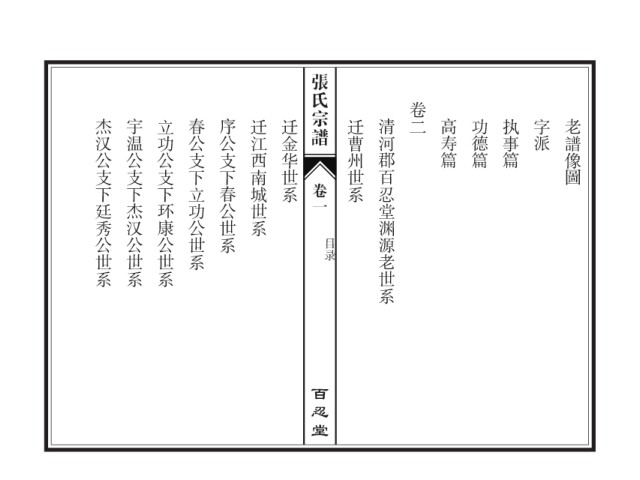 张氏宗谱 卷二 杰汉公支下廷秀公世系 宇温公支下杰汉公世系 立功公支下环康公世系 春公支下立功公世系 序公支下春公世系 迁江西南城世系 迁金华世系 迁曹州世系 清河郡百忍堂渊源老世系 高寿篇 功德篇 执事篇 字派 老譜像圖 卷一 目录 百忍堂