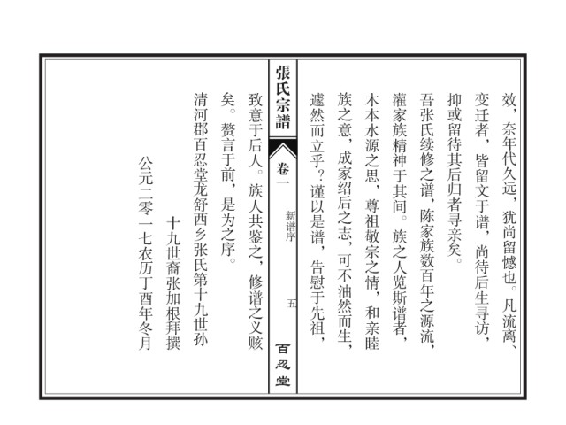 张氏宗谱 清河郡百忍堂龙舒西乡张氏第十九世孙 矣。赘言于前,是为之序。 致意于后人。族人共鉴之,修谱之义赅 遽然而立乎?谨以是谱,告慰于先祖, 族之意,成家绍后之志,可不油然而生, 木本水源之思,尊祖敬宗之情,和亲睦 灌家族精神于其间。族之人览斯谱者, 吾张氏续修之谱,陈家族数百年之源流, 抑或留待其后归者寻亲矣。 变迁者,皆留文于谱,尚待后生寻访, 效,奈年代久远,犹尚留憾也。凡流离、 公元二零一七农历丁酉年冬月 卷一 十九世裔张加根拜撰 新谱序 五 百忍堂