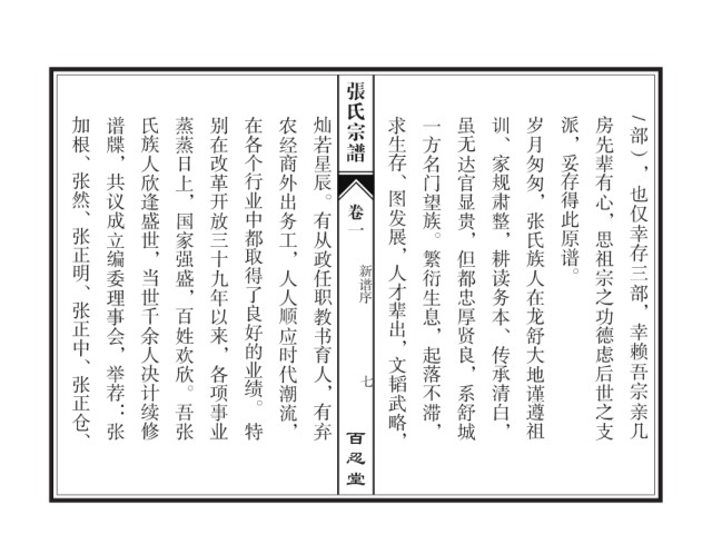 加根、张然、张正明、张正中、张正仓、 谱牒,共议成立编委理事会,举荐:张 氏族人欣逢盛世,当世千余人决计续修 蒸蒸日上,国家强盛,百姓欢欣。吾张 别在改革开放三十九年以来,各项事业 在各个行业中都取得了良好的业绩。 农经商外出务工,人人顺应时代潮流, 灿若星辰。有从政任职教书育人,有弃 求生存、图发展,人才辈出,文韬武略, 一方名门望族。繁衍生息,起落不滞, 虽无达官显贵,但都忠厚贤良,系舒城 训、家规肃整,耕读务本、传承清白, 岁月匆匆,张氏族人在龙舒大地谨遵祖 派,妥存得此原谱。 房先辈有心,思祖宗之功德虑后世之支