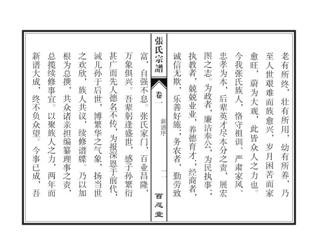 新谱大成,终不负众望。今事已成,吾 总揽续修事宜。以聚族人之力,两年而 根为总撰,共众诸亲担编纂理事之责, 之欢欣,族人共议,续修谱牒。乃以加 诫儿孙于后世,博繁华之气象,扬当世 甚广而先人德名不传,为报深恩于前代, 万象俱兴。吾辈躬逢盛世,感子孙繁衍 富,自强不息。张氏家门,百业昌隆, 诚信无欺,乐善好施;务农者,勤劳致 执教者,兢兢业业,养德育才;经商者, 图之志。为政者,廉洁奉公,为民执事; 忠孝为本,后辈英才尽本分之责,展宏 今我张氏族人,恪守祖训、严肃家风、 愈旺,蔚为大观,此皆众人之力也。 至人世艰难而族愈兴,岁月困苦而家 老有所终,壮有所用,幼有所养,乃