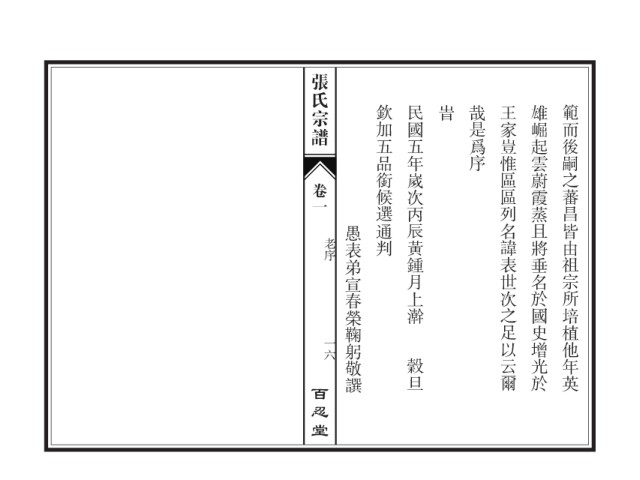 张氏宗谱 欽加五品銜候選通判 民國五年嵗次丙辰黃鍾月上澣 旹 哉是爲序 王家豈惟區區列名諱表世次之足以云爾 雄崛起雲蔚霞蒸且將垂名於國史增光於 範而後嗣之蕃昌皆由祖宗所培植他年英 卷一 愚表弟宣春榮鞠躬敬譔 老序 一六 穀旦 百忍堂