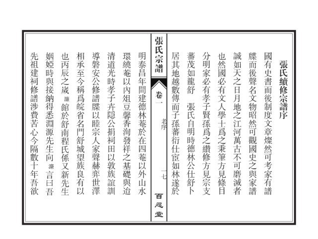 先祖建祠修譜涉費苦心今隔數十年吾欲 姻婭時與接納得悉淵源先生向 也丙辰之嵗 相承至今稱爲皖省名門舒城望族良有以 導磐安公修譜牒以睦宗人家聲赫弈世澤 清道光時孝子卉隠公捐祠田以敦族誼訓 環繞菴以內俎豆馨香洵發祥之基礎與迨 明泰昌年間建德林菴於在四菴以外山水 居其地越數傳而子孫蕃衍仕宦如林遂於 蕃茂如龍舒 分明家必有孝子賢孫爲之纘修方見宗支 也然國必有文人學士爲之秉筆方見條目 誠如天之日月地之江河萬古不可磨滅者 牒而後聲名文物昭然可觀國史之與家譜 國有史書而後制度文章燦然可考家有譜 張氏續修宗譜序