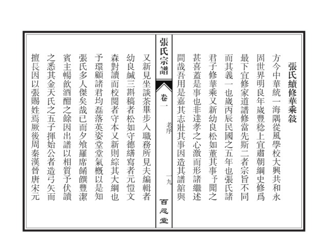擅長因以張賜姓焉厥後周秦漢晉唐宋元 之悉其金天氏之五子揮始公者造弓矢而 賓主暢飲酒酣之餘因出譜以相質予伏讀 張氏多人傑矣哉已而夕飧羅席餚饌豐潔 予環顧諸君均磊落英姿堂堂氣槪以是知 森對讀而校閱者守本又新則綜其大綱也 幼良緘三斟稿者松如守德繕寫者元愷文 又新見坐談茶畢步入職務所見夫編輯者 間哉吾用是嘉其志壯其事因造其譜舘與 甚喜蓋是事也非達孝之心激而形諸繼述 君子修華乘又新幼良松如董其事 而其義一也嵗丙辰民國之五年也張氏諸 最下宜修家道譜修當先斯二者宗旨不同 固世界明良年嵗豐稔上宜肅朝綱史修爲 方今中華統一海隅從風學校大興共和永 張氏續修華乘敍