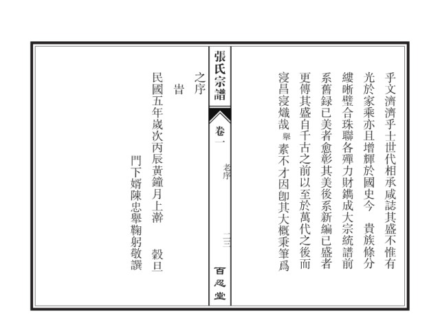 张氏宗谱 民國五年嵗次丙辰黃鐘月上澣 旹 之序 寖昌寖熾哉 更傳其盛自千古之前以至於萬代之後而 系舊録已美者愈彰其美後系新編已盛者 縷晰璧合珠聯各殫力財鐫成大宗統譜前 光於家乘亦且增輝於國史今 乎文濟濟乎士世代相承咸誌其盛不惟有 卷一 舉 素不才因卽其大概秉筆爲 門下婿陳忠舉鞠躬敬譔 老序 二三 貴族條分 穀旦 百忍堂