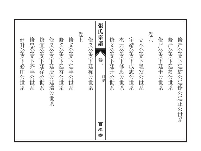 张氏宗谱 卷七 卷六 廷升公支下必庄公世系 修忠公支下齐丰公世系 修宜公支下廷存公世系 修义公支下廷庆公廷瑞公世系 修义公支下廷益公世系 修义公支下廷丰公世系 修义公支下廷栋公世系 修义公支下廷升公世系 杰元公支下修忠公世系 宇靖公支下成志公世系 立本公支下隆发公世系 修严公支下廷圭公世系 修严公支下廷笏公世系 修严公支下廷尉公廷僚公廷正公世系 卷一 目录 百忍堂
