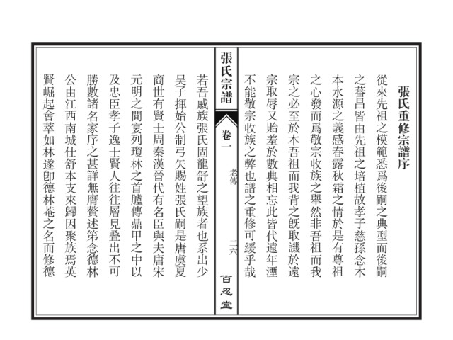 賢崛起會萃如林遂卽德林菴之名而修德 公由江西南城仕舒本支來歸因聚族焉英 勝數諸名家序之甚詳無膺贅述第念德林 及忠臣孝子逸士賢人往往層見叠出不可 元明之間宴列瓊林之首臚傳鼎甲之中以 商世有賢士周秦漢晉代有名臣與夫唐宋 昊子揮始公制弓矢賜姓張氏嗣是唐虞夏 若吾戚族張氏固龍舒之望族者也系出少 不能敬宗收族之弊也譜之重修可緩乎哉 宗取辱又貽羞於數典相忘此皆代遠年湮 宗之必至於本吾祖而我背之旣取譏於遠 之心發而爲敬宗收族之舉然非吾祖而我 本水源之義感春露秋霜之情於是有尊祖 之蕃昌皆由先祖之培植故孝子慈孫念木 從來先祖之模範悉爲後嗣之典型而後嗣