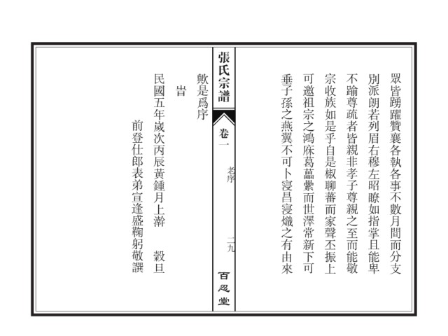 张氏宗谱 民國五年嵗次丙辰黃鍾月上澣 旹 歟是爲序 垂子孫之燕翼不可卜寖昌寖熾之有由來 可邀祖宗之鴻庥葛藟纍而世澤常新下可 宗收族如是乎自是椒聊蕃而家聲丕振上 不踰尊疏者皆親非孝子尊親之至而能敬 別派朗若列眉右穆左昭瞭如指掌且能卑 眾皆踴躍贊襄各執各事不數月間而分支 前登仕郎表弟宣逢盛鞠躬敬譔 卷一 老序 二九 穀旦 百忍堂