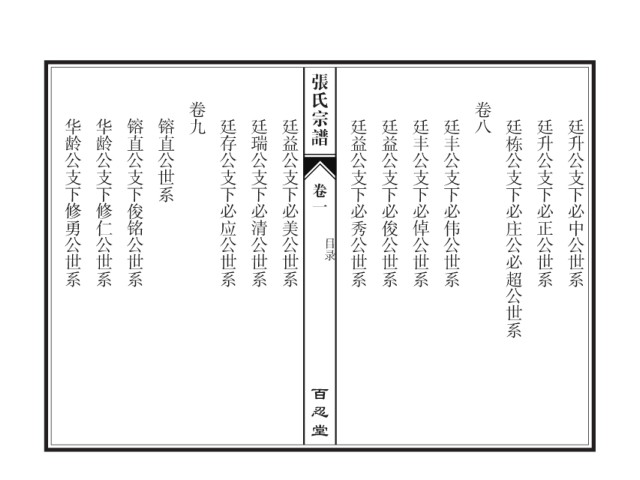 张氏宗谱 卷九 卷八 华龄公支下修勇公世系 华龄公支下修仁公世系 镕直公支下俊铭公世系 镕直公世系 廷存公支下必应公世系 廷瑞公支下必清公世系 廷益公支下必美公世系 廷益公支下必秀公世系 廷益公支下必俊公世系 廷丰公支下必倬公世系 廷丰公支下必伟公世系 廷栋公支下必庄公必超公世系 廷升公支下必正公世系 廷升公支下必中公世系 卷一 目录 百忍堂