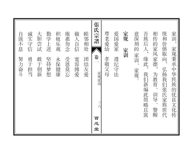 张氏宗谱 自强不息 诚实守信 大胆尝试 勤学上进 积极乐观 施惠勿念 做人自信 睦邻相处 尊老爱幼 爱国爱家 家规 意深刻的 吾族后人,缘此,我们新编此简略且寓 相传的家风家德,为教育、训导、警醒 统和价值取向,弘扬我们张氏家族世代 家训、家规秉承中华民族的优良文化传 家训 家训、家规。 受恩莫忘 宽容博爱 团结友爱 勇于担当 努力奋斗 卷一 孝敬父母 遵纪守法 敢于创新 永保健康 坚持梦想 家规家训 三六 百忍堂