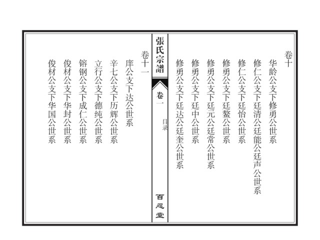 张氏宗谱 卷十一 卷十 俊材公支下华国公世系 俊材公支下华封公世系 镕钢公支下成仁公世系 立行公支下德纯公世系 辛七公支下历辉公世系 庠公支下达公世系 修勇公支下廷达公廷奎公世系 修勇公支下廷中公世系 修勇公支下廷元公廷常公世系 修勇公支下廷鳌公世系 修仁公支下廷怡公世系 修仁公支下廷清公廷能公廷声公世系 华龄公支下修勇公世系 卷一 目录 百忍堂