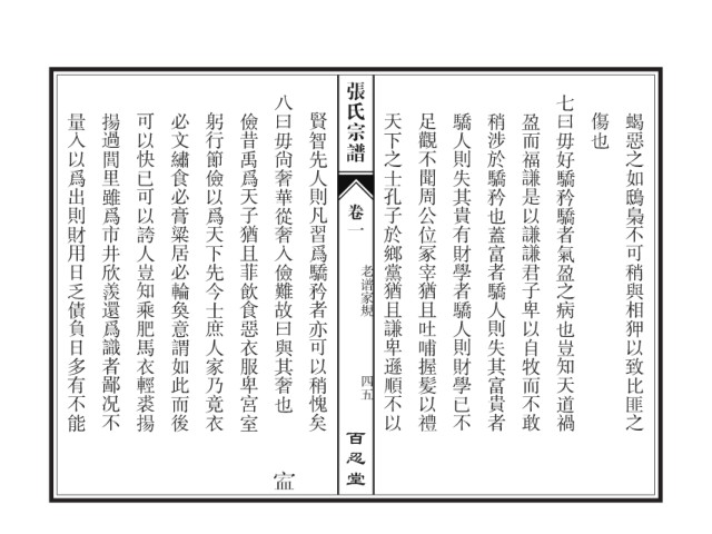 张氏宗谱 天下之士孔子於鄉黨猶且謙卑遜順不以 足觀不聞周公位冢宰猶且吐哺握髪以禮 驕人則失其貴有財學者驕人則財學已不 稍涉於驕矜也蓋富者驕人則失其富貴者 盈而福謙是以謙謙君子卑以自牧而不敢 七曰毋好驕矜驕者氣盈之病也豈知天道禍 傷也 蝎惡之如鴟梟不可稍與相狎以致比匪之