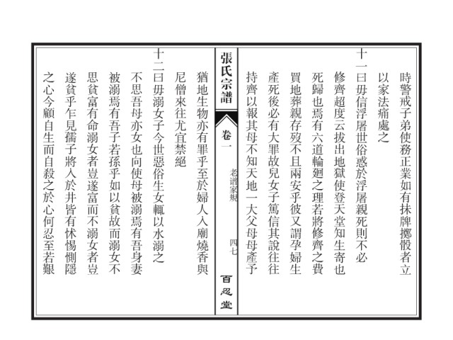 十二曰毋溺女子今世惡俗生女輒以水溺之 尼僧來往尤宜禁絕 猶地生物亦有罪乎至於婦人入廟燒香與 张氏宗谱 持齊以報其母不知天地一大父母母產予 產死後必有大罪故兒女子篤信其說往往 買地葬親存歿不且兩安乎彼又謂孕婦生 死歸也焉有六道輪廻之理若將修齊之費 修齊超度云拔出地獄使登天堂知生寄也 十一曰毋信浮屠世俗惑於浮屠親死則不必 以家法痛處之 時警戒子弟使務正業如有抺牌擲骰者立