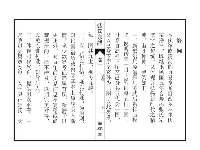 是改过去男尊女卑,女子只记姓氏,为 三、体现时代气息,提供男女平等。一 以免以讹传讹,误导后人。 难理清的一律不涉及,以期完美对接, 更正外,对百年前支系信息不完整或尚 谱。除少数经考证确属有误,新谱予以 对民国谱所载内容基本上原貌录入新 二、以 每二图共九世,视为九族。 又以己身下序至玄孙为二图。以此类推, 世系自高祖下序至己身共五代为一图, 式,使阅谱者一目了然。即每五世一图: 一、新谱沿用原谱采用苏式后系排版模 神,由此种种,罗例如下。 谱》之传统,又体现并弘扬新时代之精 宗谱》,既继承民国五年合修《张氏宗 本次续修清河郡百忍堂龙舒西乡《张氏