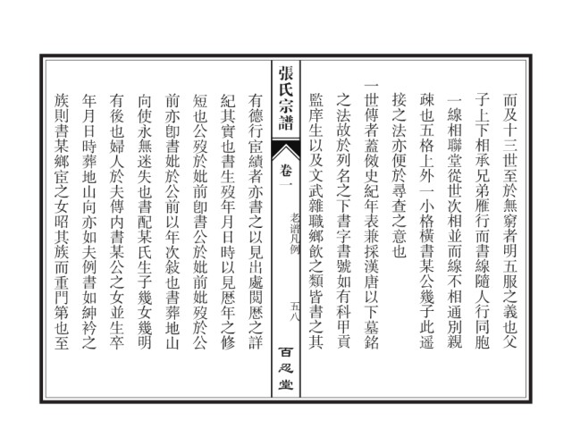 张氏宗谱 監庠生以及文武雜職鄉飲之類皆書之其 之法故於列名之下書字書號如有科甲貢 一世傳者蓋傚史紀年表兼採漢唐以下墓銘 接之法亦便於尋查之意也 疎也五格上外一小格橫書某公幾子此遥 一線相聯堂從世次相並而線不相通別親 子上下相承兄弟雁行而書線隨人行同胞 而及十三世至於無窮者明五服之義也父