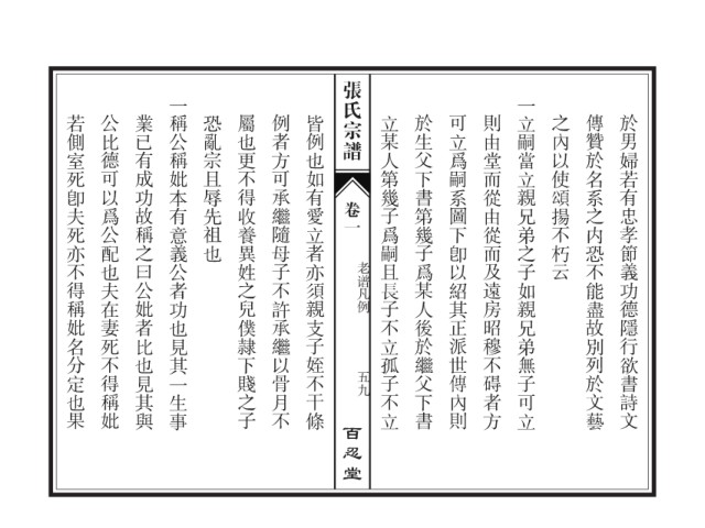 张氏宗谱 立某人第幾子爲嗣且長子不立孤子不立 於生父下書第幾子爲某人後於繼父下書 可立爲嗣系圖下卽以紹其正派世傳內則 則由堂而從由從而及遠房昭穆不碍者方 一立嗣當立親兄弟之子如親兄弟無子可立 之內以使頌揚不朽云 傳贊於名系之内恐不能盡故別列於文藝 於男婦若有忠孝節義功德隱行欲書詩文