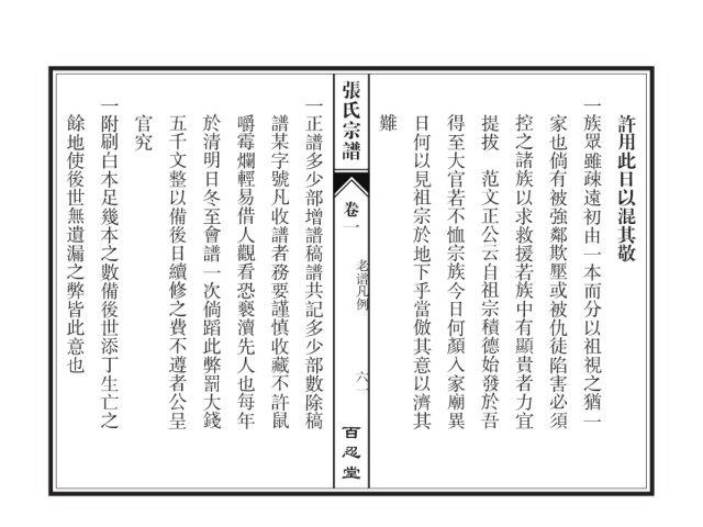 张氏宗谱 難 日何以見祖宗於地下乎當倣其意以濟其 得至大官若不恤宗族今日何顏入家廟異 提拔 控之諸族以求救援若族中有顯貴者力宜 家也倘有被強鄰欺壓或被仇徒陷害必須 一族眾雖疎遠初由一本而分以祖視之猶一 許用此日以混其敬