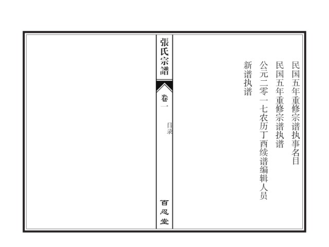 张氏宗谱 新谱执谱 公元二零一七农历丁酉续谱编辑人员 民国五年重修宗谱执谱 民国五年重修宗谱执事名目 卷一 目录 百忍堂