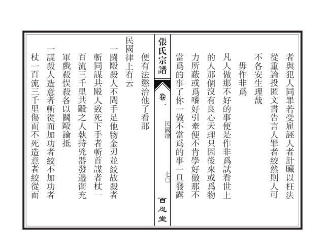 民國律上有云 便有法懲治他了看那 张氏宗谱 當爲的事了你一做不當爲的事一旦發露 力所蔽或爲嗜好引牽便不肯學好做那不 的人那個沒有良心天理只因後來或爲物 凡人做那不好的事便是作非爲試看世上 毋作非爲 不各安生理哉 從重論投匿文書告言人罪者絞然則人可 者與犯人同罪若受雇誣人者計贜以枉法