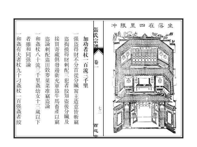 张氏宗谱 一强盜得財不分首從分贜窩主造意皆斬竊 冲限里四在落坐 一和姦杖八十流三千里姦幼女十三嵗以下 一和姦有夫者杖九十刁姦杖一百强姦者絞 者雖和同强論 盜論剌配盜田穀麥菓菜准竊盜論 接買寄藏俱發邊衛充軍盜牛馬畜產以竊 盜掏摸得財剌配三犯者絞知盗後分贜及 加功者杖一百流三千里 卷一 七二 百忍堂