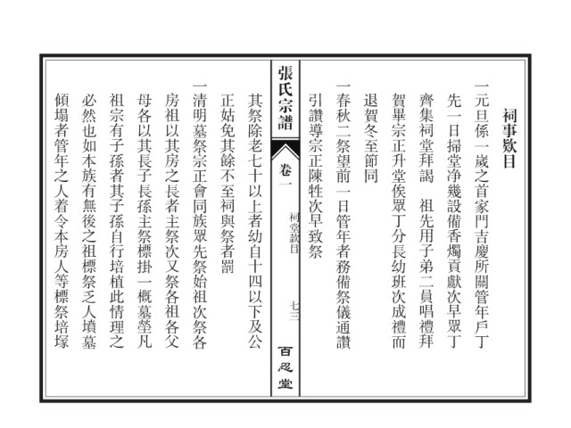 张氏宗谱 引讚導宗正陳牲次早致祭 一春秋二祭望前一日管年者務備祭儀通讚 退賀冬至節同 賀畢宗正升堂俟眾丁分長幼班次成禮而 齊集祠堂拜謁 先一日掃堂净幾設備香燭貢獻次早眾丁 一元旦係一嵗之首家門吉慶所關管年戶丁 祠事欵目