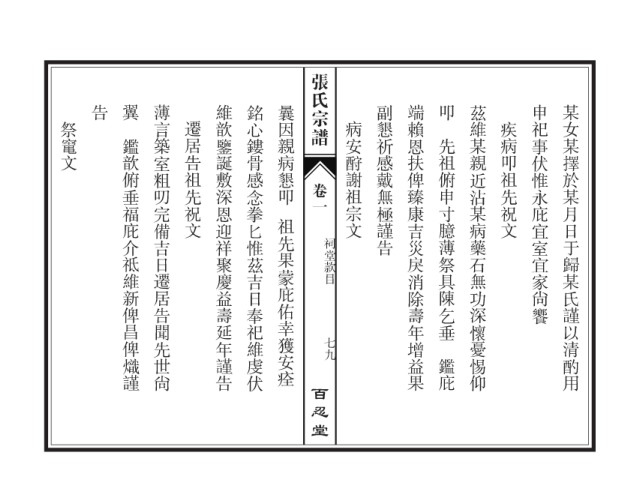 张氏宗谱 告 鑑歆俯垂福庇介祗維新俾昌俾熾謹 翼 薄言築室粗叨完備吉日遷居告聞先世尙 遷居告祖先祝文 維歆鑒誕敷深恩迎祥聚慶益壽延年謹告 銘心鏤骨感念拳匕惟茲吉日奉祀維虔伏 曩因親病懇叩 病安酧謝祖宗文 副懇祈感戴無極謹告 端賴恩扶俾臻康吉災戾消除壽年增益果 先祖俯申寸臆薄祭具陳乞垂 叩 茲維某親近沾某病藥石無功深懷憂惕仰 疾病叩祖先祝文 申祀事伏惟永庇宜室宜家尙饗 某女某擇於某月日于歸某氏謹以清酌用 祭竃文 卷一 祖先果蒙庇佑幸獲安痊 祠堂款目 七九 鑑庇 百忍堂