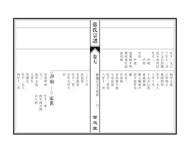 张氏宗谱 汤邦锁 塘村汤庄组 适棠树乡西 生女一 生子二 店乡查湾村 十九日舒阙 三年十二月 生于一九六 卷七 声菊 声府 声成 四年十二月 生于一九八 驾驶员 大货车 高中文化 行二 实名申府 声府 日 五年九月六 生于二零一 实名林雯 次家雯 二十三日 修義公支下世系 八年十一月 生于二零零 小学在读 实名林子欣 长家欣 生女二 嗣 府子家茗为 兼立胞弟声 省南麻镇 十九日江苏 八年十月二 生于一九八 集团职员 江苏鸿立 初中文化 日午时 四年四月四 生于二零一 家茗 一〇一 百忍堂