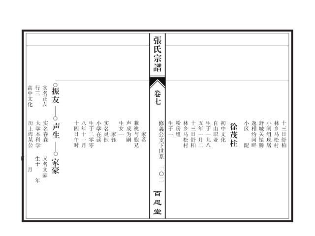 张氏宗谱 高中文化 行三 实名正友 振友 卷七 历上海某公 大学本科学 实名春森 声生 十四日午时 八年十一月 生于二零零 小学在读 实名灵钰 生女一 声成为嗣 兼祧与胞兄 修義公支下世系 生子一 粉房组 林乡马松村 十三日舒柏 五年一月二 生于一九八 自由职业 初中文化 徐茂柱 小区 逸相约河畔 舒城关镇腾 小闸组现居 林乡马松村 十三日舒柏 家钰 家茗 配 日 生于 又名文豪 家豪 月 一〇二 年 百忍堂
