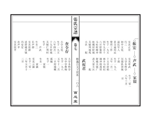 二日 二年五月十 生于二零一 实名云涵 生女一 生子一 溪镇 一日舒城桃 五年十二月 生于一九八 历中学教师 大学本科学 修義公支下世系 武祝君 进久富小区 舒城关镇广 堰冲组现居 林乡马松村 十五日舒柏 五年一月二 生于一九八 干部 历部队营级 大学本科学 实名申武 声武