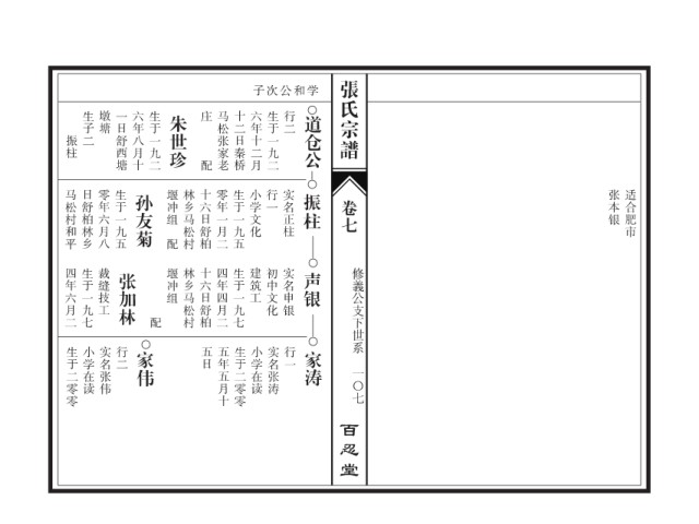 四年六月二 生于一九七 裁缝技工 张加林 堰冲组 林乡马松村 十六日舒柏 四年四月二 生于一九七 建筑工 初中文化 实名申银 声银 修義公支下世系