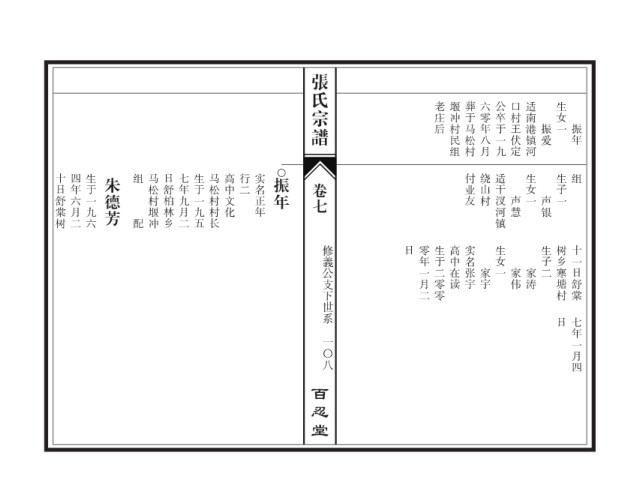 张氏宗谱 老庄后 堰冲村民组 葬于马松村 六零年八月 公卒于一九 口村王伏定 适南港镇河 生女一 振年 振爱 十日舒棠树 四年六月二 生于一九六 朱德芳 组 马松村堰冲 日舒柏林乡 七年九月二 生于一九五 马松村村长 高中文化 行二 实名正年 振年 付业友 绕山村 适干汊河镇 生女一 生子一 组 卷七 声慧 声银 配 修義公支下世系 日 零年一月二 生于二零零 高中在读 实名张宇 生女一 生子二 树乡寒塘村 十一日舒棠 家涛 家伟 家宇 日 七年一月四 一〇八 百忍堂
