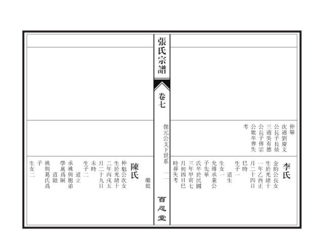 张氏宗谱 卷七 傑元公支下世系 考 公妣卒葬失 公長子傳宗 三適吳有德 公長子長鼎 次適劉慶文 仲舉 生女二 子 祧與葛氏爲 學萬爲嗣 承祧與胞弟 生子二 未時 月二十九日 二年丙戌五 生於 仲魁公次女 陳氏 時葬失考 月初四日巳 三年甲寅七 氏卒於民國 子先華 允傳承業公 生女一 生子一 巳時 月二十四日 一年乙酉正 生於光緒十 金約公長女 李氏 道生 道銀 光緒十 一一 道立 繼妣 百忍堂