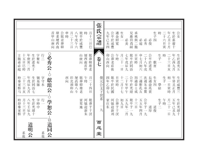 立胞弟必超 十五日巳時 年庚寅二月 生於道光十 字聚有 行二 必秀公 山庚向 埂西南首甲 妣葬韓塘老 卯山酉向 公葬老莊後 午時 月二十一日 七年戊辰九 妣卒於同治 日寅時 申七月初六 二十八年戊 公卒於道光 生子一 時 二十三日亥 年乙酉九月 生於道光五