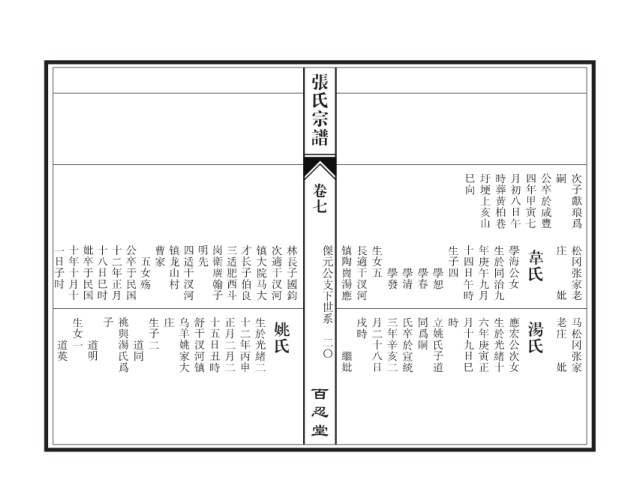 生女一 子 祧與湯氏爲 生子二 庄 乌羊姚家大 舒干汊河镇 十五日丑時 正月二月二 十二年丙申 生於光緒二 姚氏 戌時 月二十八日 三年辛亥二 氏卒於宣統 同爲嗣 立姚氏子道 時 月十九日巳 六年庚寅正 生於光緒十 應宏公次女 湯氏 老庄 马松冈张家