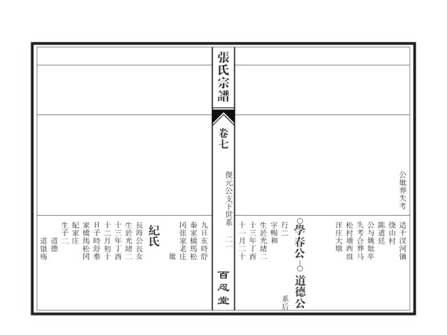 张氏宗谱 卷七 傑元公支下世系 公妣葬失考 生子二 紀家庄 家橋馬松冈 日子時舒秦 十二月初十 十三年丁酉 生於光緒二 長海公長女 紀氏 冈张家老庄 秦家橋馬松 九日亥時舒 十一月二十 十三年丁酉 生於光緒二 字暢和 行二 學春公 汪庄大墩 松村塘西组 失考合葬马 公与姚妣卒 陈道廷 绕山村 适干汊河镇 道银殇 二一 道德 妣 百忍堂 道德公 系后