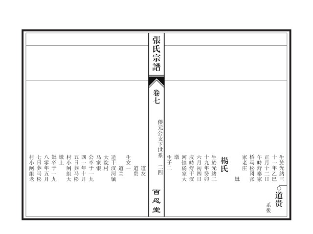 张氏宗谱 卷七 傑元公支下世系 村小闸组老 七日葬马松 八零年五月 妣卒于一九 墩上 村小闸组大 五日葬马松 四一年十月 公卒于一九 马家银 大院村 适干汊河镇 生女一 生子二 墩 河镇杨家大 戌時舒干汊 六月初四日 十九年癸卯 生於光緒二 楊氏 家老庄 桥马松冈张 午時舒秦家 正月十二日 十一年乙巳 生於光緒三 道友 道兰 二四 道贵 妣 百忍堂 道贵 系後
