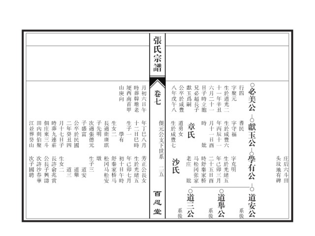 次子國聘 次許沙春華 公長子興濤 長許俞兆賞 生女二 生子三 墩 松冈马松安 舒秦家桥马 初十日午時 年己卯七月 生於光緒五 芳正公長女 沙氏 老庄 马松冈张家 時舒秦家桥 二十五日酉 年己卯三月 生於光緒五 字克明 學有公 头坟地有碑 庄后六斗田
