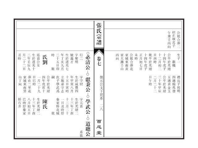 丑時 月二十二日 二年壬辰九 生於道光十 廷貴公女 氏劉 時 二十五日卯 年丁亥九月 生於道光七 號義才 字聚明 行二 必清公 丙向 家大灘壬山 家城東南黃 公妣合葬花 未時 正月初七日 十四年戊子 妣卒於光緒 日酉時 十二月初二 十四年戊子 公卒於光緒 生子一