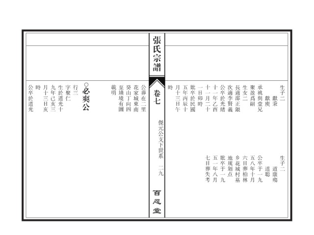 张氏宗谱 公卒於道光 時 月十三日亥 九年己亥三 生於道光十 字聚仁 行三 必爽公 載明 至墳境有圖 癸山丁向四 花家城東南 公葬在二里 時 月十三日午 五年丙辰十 妣卒於民國 一日卯時 十一月二十 十一年乙酉 公卒於光緒 次適李賢義 長適邵正銀 生女二 聚盈爲嗣 承祧與堂兄 生子二 卷七 獻庾 獻秉 傑元公支下世系 七日葬失考 五一年八月 妣卒于一九 地规划点 乡花城村墓 六日葬柏林 五八年十月 公卒于一九 生子二 二九 道聪 道康殤 百忍堂