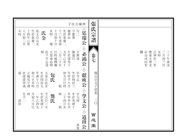 孫 次孫道田爲 立胞兄守發 初六日未時 年庚午八月 生於同治九 大春公次女 包氏 初九日巳時 年甲子八月 生於同治三 字守志 獻庾公 傑元公支下世系