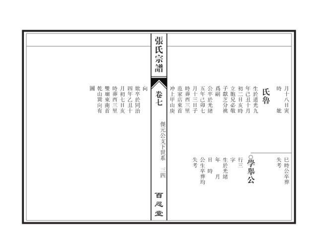 张氏宗谱 圖 乾山巽向有 雙廟東南首 時葬西三里 月初七日亥 四年乙丑十 妣卒於同治 向 冲上甲山庚 范家店東首 時葬西三里 月十三日子 五年己卯七 公卒於光緒 爲嗣 子獻芝分祧 立胞兄必敬 初二日亥時 年己丑十月 生於道光九 氏魯 時 月十八日寅 卷七 妣 傑元公支下世系 失考 公生卒葬均 日 年 生於光緒 字 行三 學舉公 失考 巳時公卒葬 三四 時 月 百忍堂