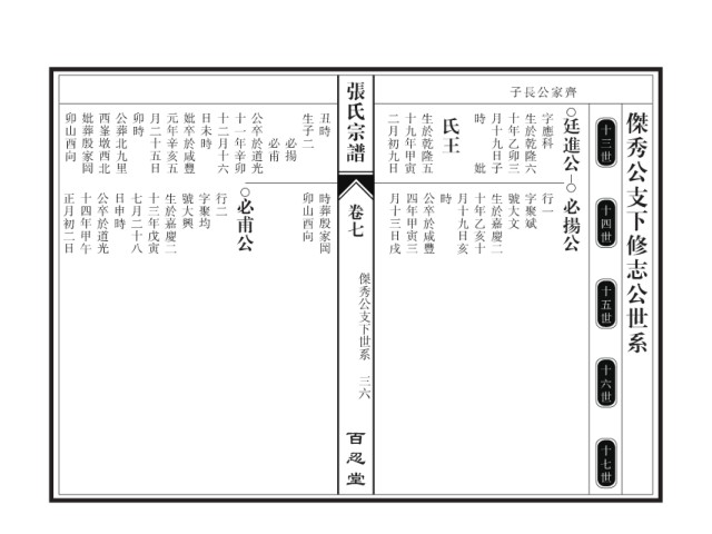 卯山酉向 妣葬殷家岡 西峯墩西北 公葬北九里 卯時 月二十五日 元年辛亥五 妣卒於咸豐 日未時 十二月十六 十一年辛卯 公卒於道光 生子二 丑時 二月初九日 十九年甲寅 生於乾隆五 氏王 時 月十九日子 十年乙卯三 生於乾隆六 字應科 廷進公 傑秀公支下修志公世系