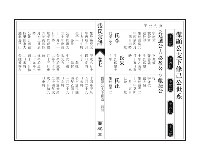 日申時 戌九月初九 二十四年戊 妣卒於光緒 日亥時 一月二十九 四年乙卯十 公卒於民國 日未時 五月二十九 十四年甲辰 傑顯公支下世系 生於道光二 氏汪 巳時 十月十五日 十三年癸卯 生於道光二 號大發 字守仁 行一 獻捷公