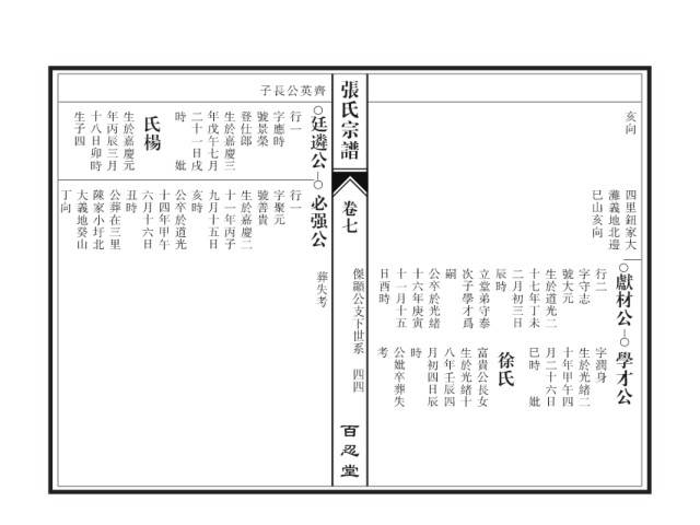 生子四 十八日卯時 年丙辰三月 生於嘉慶元 氏楊 時 二十一日戌 年戊午七月 生於嘉慶三 登仕郎 號景榮 字應時 行 廷遴公 亥向