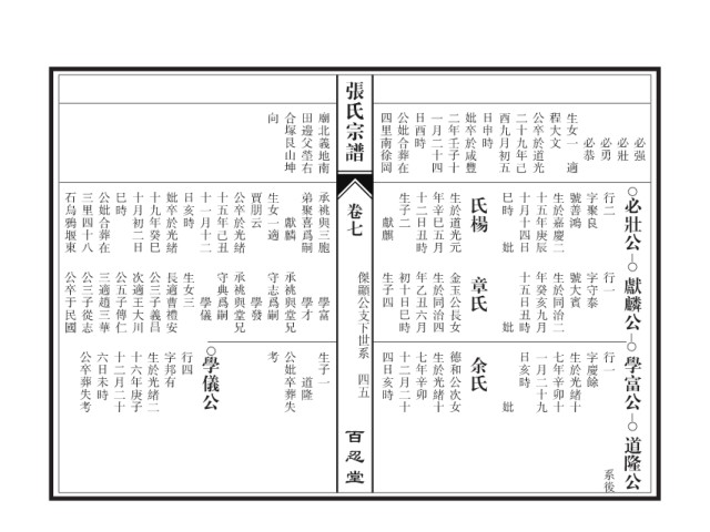 公卒葬失考 六日未時 十二月二十 十六年庚子 生於光緒二 字邦有 行四 學儀公 考 公妣卒葬失 生子一 四日亥時 十二月二十 七年辛卯 生於光緒十 德和公次女 余氏 日亥時 一月二十九 七年辛卯十 生於光緒十 字慶餘 行一 學富公