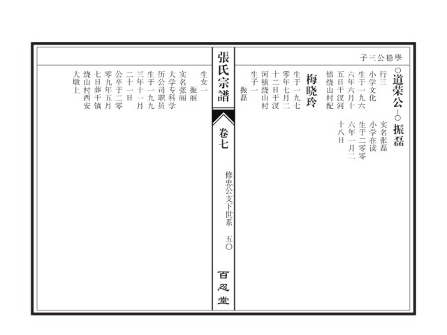 张氏宗谱 子三公稳學 大墩上 绕山村西安 七日葬干镇 零九年五月 公卒于二零 二十一日 三年十一月 生于一九九 历公司职员 大学专科学 实名张丽 生女一 生子一 河镇绕山村 十二日干汊 零年七月二 生于一九七 梅晓玲 镇绕山村配 五日干汊河 六年六月十 生于一九六 小学文化 行三 道荣公 振磊 振丽 十八日 六年一月二 生于二零零 小学在读 实名张磊 振磊 卷七 修忠公支下世系 五〇 百忍堂